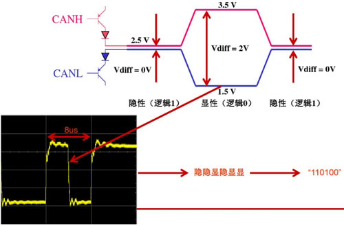 結(jié)構(gòu)上由7個段組成,幀起始、仲裁段、控制段、數(shù)據(jù)段、CRC段、ACK段和幀結(jié)束(VBUS/2)進(jìn)行比較。圖下圖顯示了實現(xiàn)該方法所用的電路。