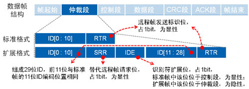 與數(shù)據(jù)幀相比,遠(yuǎn)程幀結(jié)構(gòu)上無數(shù)據(jù)段,由6個段組成,同 理分標(biāo)準(zhǔn)幀格式和擴(kuò)展幀格式,且RTR位為1(隱性電平)。