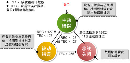為防止自身由于某些原因?qū)е聼o法正常接收額節(jié)點一直發(fā)送錯誤幀,干擾其他節(jié)點通信,CAN BUS 規(guī)定了節(jié)點的3種狀態(tài)及其行為。