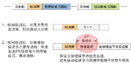 幀間隔用于將數(shù)據(jù)幀或遠(yuǎn)程幀和他們之間的幀分離開, 但過載幀和錯誤幀前門不會插入幀間隔。