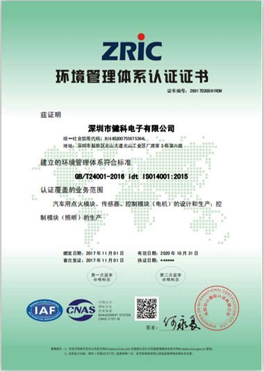 健科電子ISO14001/OHSAS18001體系順利通過認證,于2017年11月1日正式頒發(fā)了證書。
