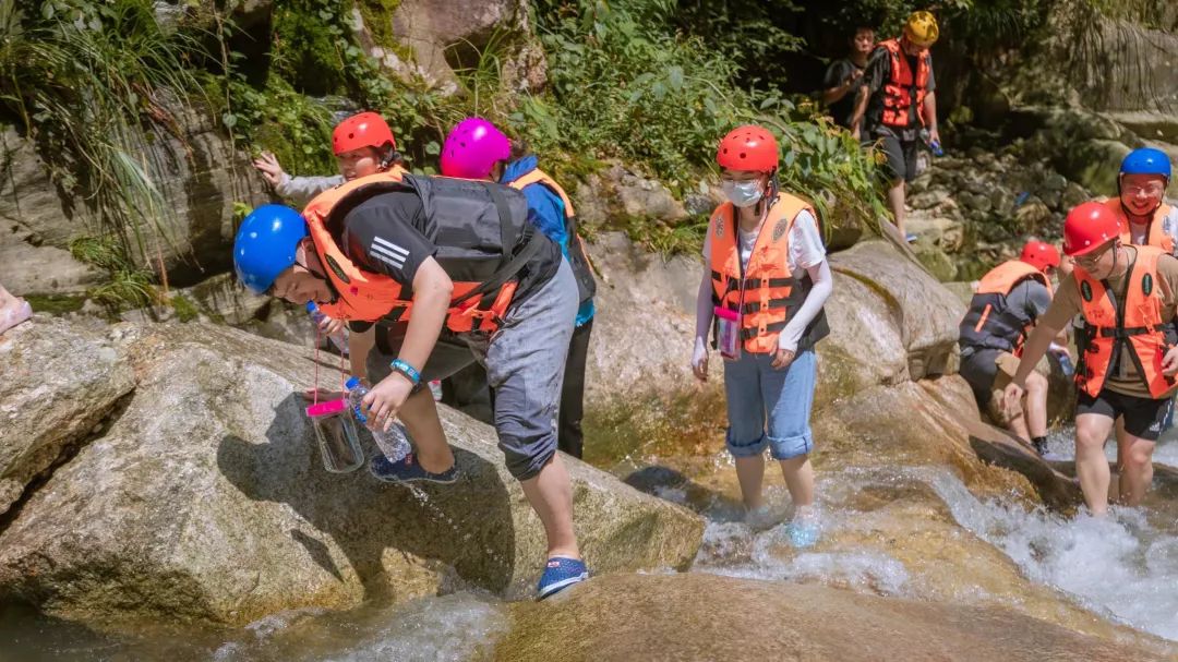 逆流而上的過程考驗著健科小伙伴們的體力和耐力,但沿途也一樣處處充滿著驚喜。水流聲、蟲鳴鳥叫聲、每個人的歡聲笑語,在山林中交織在一起。沒有裝備的人脫下帽子舀水回?fù)羲畼屵x手,另外一邊四五個大漢排成一列,坐在光滑的石槽中,順著清澈的溪水沖入水池。最刺激的是從四五米高的石頭上跳入水潭,克服內(nèi)心的恐懼,一瞬間的失重感,整個人被清涼的溪水包裹,驚險而又刺激。
